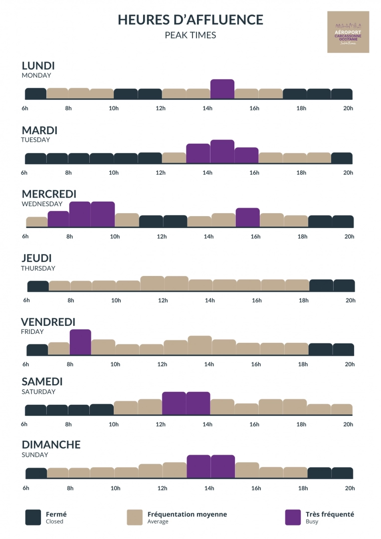 publié le :Les enregistrements et accès aux salles d'embarquement sont programmés 2h30 avant l'heure de départ les vendredis et dimanches matins ainsi que les mardis après-midi.