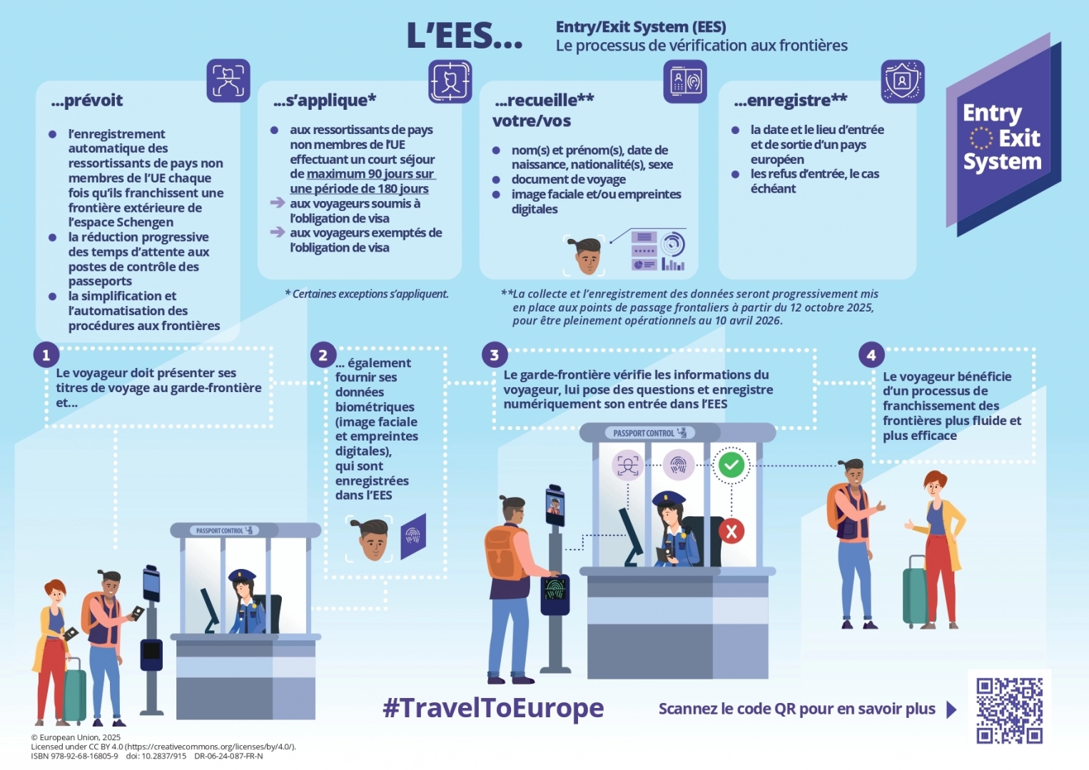 L’EES est un système informatique mis en place par l’Union Européenne pour enregistrer les entrées et sorties des voyageurs non européens (ressortissants de pays tiers) lors de leur passage aux frontières extérieures de l’UE.